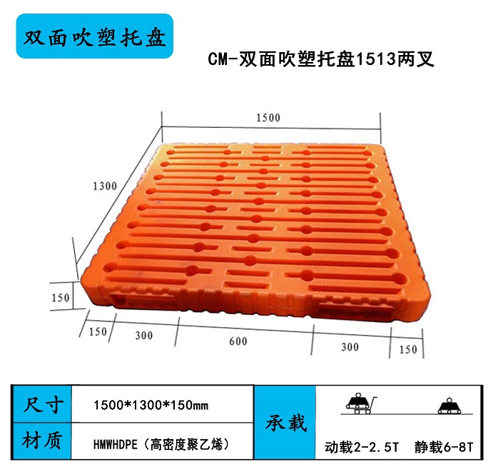 中空吹塑塑料托盤的生產(chǎn)與一般的中空制品吹塑成型方法相類似,因其產(chǎn)品較大,且為雙面型,需要較大的擠出機(jī)、合模機(jī)及模具等。目前國內(nèi)中空成型機(jī)制造廠家已經(jīng)研發(fā)出專業(yè)高速生產(chǎn)高強(qiáng)度吹塑托盤的超大型中空成型機(jī),采用HDPE(低壓高密度聚乙烯)高強(qiáng)度塑料生產(chǎn),成型速度較快,產(chǎn)品質(zhì)量較好,具有高強(qiáng)度、壽命長的特點(diǎn),一般吹塑托盤的使用壽命可以達(dá)到5~10年,同時可以在-40~70℃的環(huán)境下穩(wěn)定工作。其產(chǎn)品的動載可以達(dá)到3t以上,抗彎強(qiáng)度均是較高的水平。是高強(qiáng)度使用環(huán)境的首選托盤,目前其價格比注塑托盤偏高一些,但其使用壽命特別長,所以它的性價比是所有托盤中最高的。吹塑托盤隨著成型設(shè)備價格的大幅度降低,將會在近年內(nèi)獲得較快的發(fā)展。將對于節(jié)約有限的石油資源與物流成本有極大的好處。