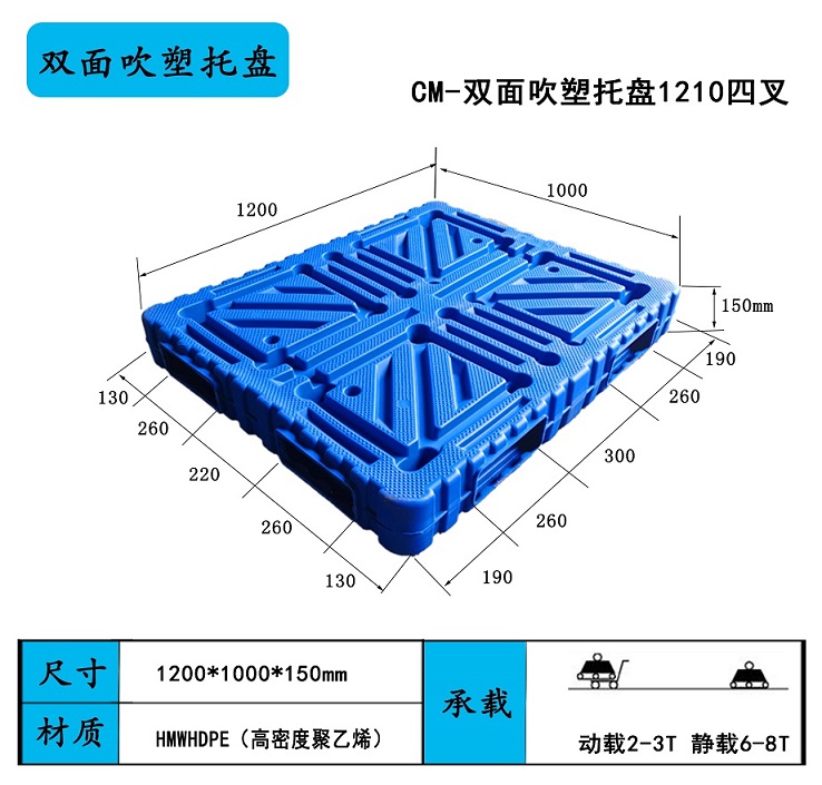 產(chǎn)品描述:1210四叉雙面吹塑托盤,吹塑托盤1.2*1米,叉車塑料托盤1210